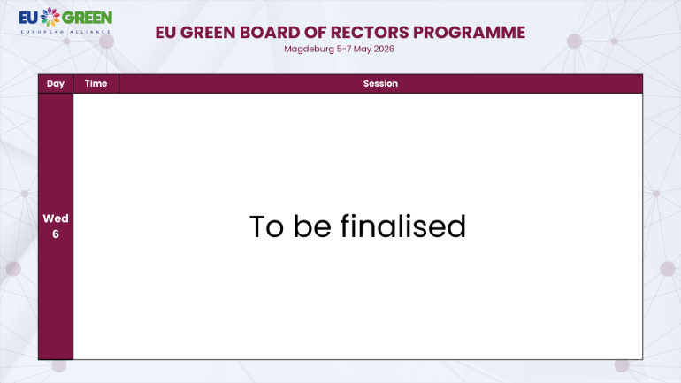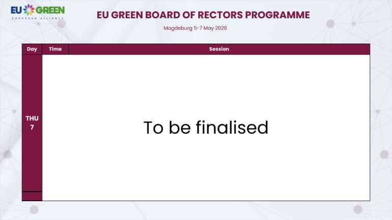 The EU GREEN University Alliance invites the rectorates of the nine partner universities to attend from 5th May 2026 to 7th May 2026. The Board of Rectors provides a platform for inter-university exchange and the strengthening of European cooperation in the field of sustainable higher education development. The aim is to develop innovative strategies that promote the transformation of academic institutions in terms of sustainability and responsibility. You can look forward to inspiring discussions and groundbreaking ideas on the future of higher education in Europe.